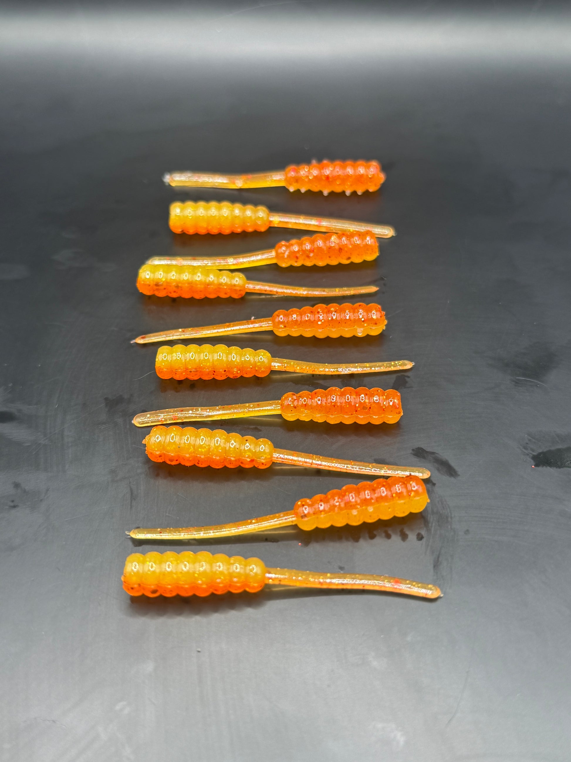 Sweet, sleek, and oh-so-effective—meet the Trout Taffy, a 2" trout jig that packs serious punch in a small package. Featuring a unique design, the body consists of small, round balls that give the lure a subtle, lifelike wobble with every twitch, mimicking the movement of small prey that trout can’t resist. The thin tail follows the body with an elegant flutter, creating an irresistible, natural presentation that entices even the most cautious fish.